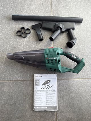 Aspirador de mano de la marca Parkside, ideal para tareas de limpieza rápidas y cómodas. Incluye varios accesorios para diferentes usos. - Tubo de extensión. - Cepillo para tapicerías. - Boquilla estrecha. - Adaptadores de conexión. - Boquilla para líquidos. -Portaboquillas.