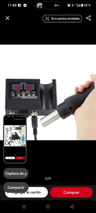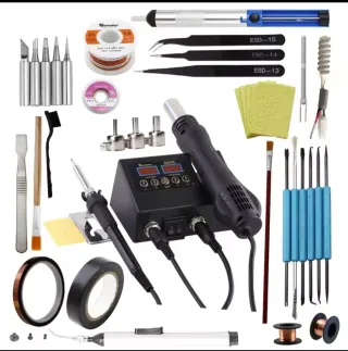 Kit de soldadura profesional que incluye una estación de aire caliente y un soldador. - Estación de soldadura S8898. - Soldador con soporte. - Pistola de aire caliente. - Juego de puntas para soldador. - Pinzas antiestáticas. - Esponjas de limpieza. - Bobina de estaño. - Cinta térmica. - Cinta aislante negra. - Cepillo de limpieza. - Herramientas de desoldadura.