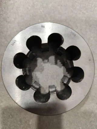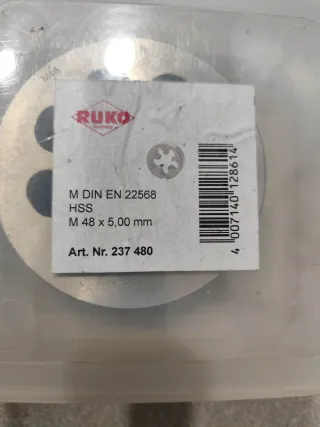 PVP: 176€ Cojinete redondo de alta calidad de la marca alemana RUKO, para cortar roscas externas métricas estándar (M48 x 5.00 mm). Es de acero de alta velocidad (HSS) rectificado, ideal para aceros no aleados, de baja aleación y metales no férricos. - Marca: RUKO Germany - Material: HSS (Acero de alta velocidad) - Medida: M 48 x 5,00 mm - Estándar: DIN EN 22568 - Peso: Aprox. 940 g - Referencia (MPN): 237 480 - Estado: NuevO. Perfecto para uso industrial o profesional.
