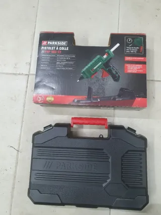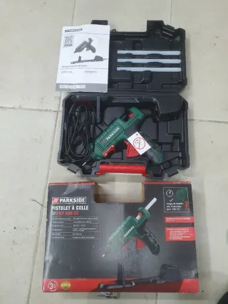 Pistola de silicona Parkside PHP 500 E3, ideal para manualidades y reparaciones. - Incluye caja de almacenamiento. - Viene con varias barras de silicona. - Manual de instrucciones incluido.