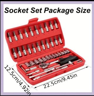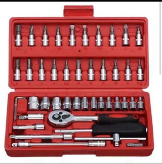 Caja de herramientas de mano de 46 piezas. Contiene una llave de carraca , destornillador y cabezales con diferentes medidas. La llave y el destornillador miden 15 cm. El producto es NUEVO SIN ESTRENAR