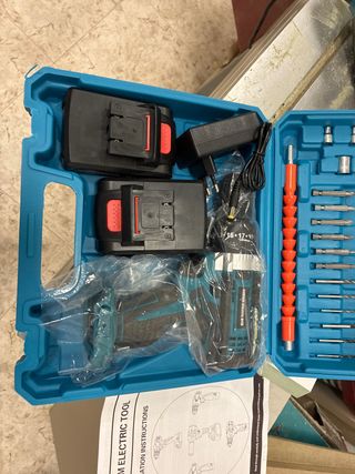 Taladro eléctrico a batería con todos sus accesorios incluidos. Ideal para trabajos en casa o profesionales. - Incluye dos baterías. - Cargador de batería. - Juego completo de puntas y brocas. - Maletín de transporte.