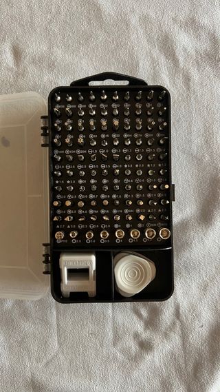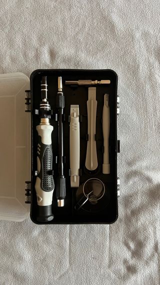 Este juego incluye un destornillador con mango ergonómico y varias puntas intercambiables, además de accesorios para reparaciones. - Mango de destornillador con diseño antideslizante. - Variedad de puntas para diferentes tipos de tornillos. - Herramientas de palanca y ventosa incluidas. - Estuche organizador compacto.
