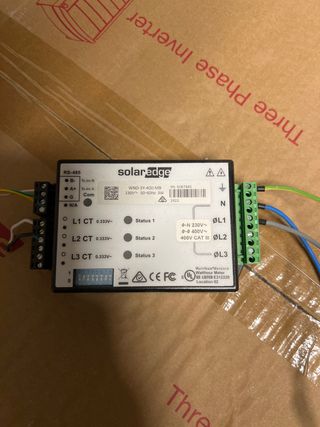 Medidor de energía SolarEdge modelo WND-3Y-400-MB. - Conexión RS-485. - Admite 3 CTs (L1, L2, L3). - Voltaje de operación 230V~ / 400V~. - Categoría CAT III.