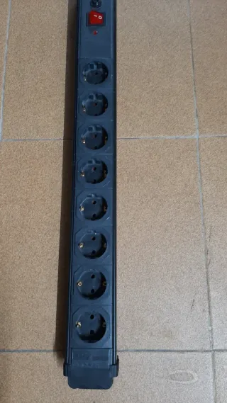 Regleta blanca de enchufes en buen estado. Es compacta y fácil de usar. - Dos tomas de corriente. - Interruptor de encendido/apagado. - Cable de alimentación incluido. - Tamaño del cable 1,48cm. - Hay que añadir 14cm más de los enchufes.