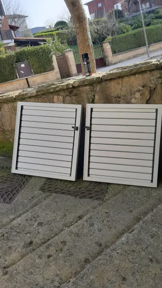 Cinco ventanas mallorquinas de aluminio,color gris listas para instalar. Dos ventanas de lamas oscilantes sin hoja batiente,miden68 cm.de ancho x 73 cm.de alto Otras dos ventanas con hojas batientes y lamas oscilantes que miden;52cm.de ancho x 73 cm.de alto Y una ventana con hoja batiente y lamas oscilantes que mide 67 cm.de ancho x 73 cm.de alto - Marco de aluminio en color gris - Lamas horizontales de aluminio. - Cierres de seguridad.Precio 70€ unidad.Se puede hacer envio