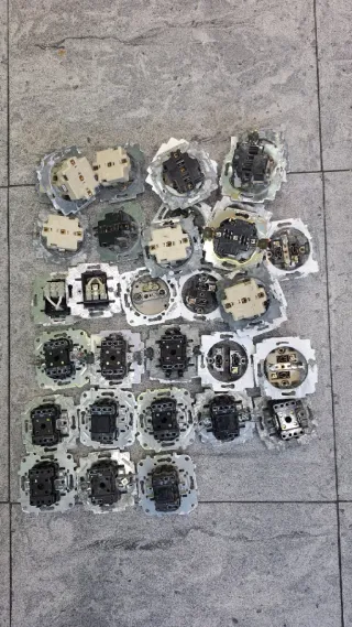 Lote completo de mecanismos eléctricos Nissen, ideales para instalaciones, reformas o repuestos: 3 cruzamiento, 5 conmutadores, 3 interruptores monopolio, 1 tapa TV/FM, 20 bases de encuestas, 11 marcos 1 elemento, 11 marcos 2E, 1 marcos 3E, 7 tapas enchufe 7288.2, 13 tapas enchufe 7288, 3 tapas enchufe 4700301, 7 teclas interruptor c/visor 4700111, 3 tapas salida cable 4700701, 5 tapas salida teléfono 7017, 3 tapas TV/FM 7X50, 2 tapas enchufe 8288-xx. El material está usado, pero en buen estado, algunos elementos internos pueden tener restos de pintura que quedan ocultos una vez montados los marcos. El lote se vende completo.