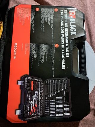 Estuche de herramientas R-BLACK con 216 piezas. - Incluye vasos de 1/4, 3/8 y 1/2. - Incluye llaves de vaso, llaves de carraca, puntas y accesorios. - Estuche de plástico resistente para almacenamiento y transporte.