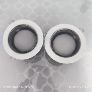 Dos focos empotrables redondos de color blanco. - Diseño moderno y minimalista. - Ideales para iluminación de interiores. Juego de dos focos de Ikea color cálido, marca Haggum 220-240v. 50-60Hz Max 8.5w Mide 13 cm de esquina a esquina lo de afuera y para meterlo en el techo 33'5 circunferencia