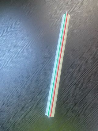 Escalímetro de plástico transparente con marcas de medición. - Escalas de 1:100, 1:200, 1:250, 1:300, 1:400, 1:500. - Medidas en centímetros y milímetros.