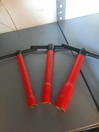 Conjunto de tres llaves de tubo con mango en T. Son de color rojo con detalles amarillos. - Mango ergonómico para un mejor agarre. - Diseño robusto para mayor durabilidad. SI LE INTERESA suelto preguntar sin compromiso