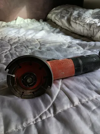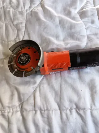Herramienta radial con disco de corte. - Disco de corte con borde diamantado. - Cuerpo de plástico naranja y negro.