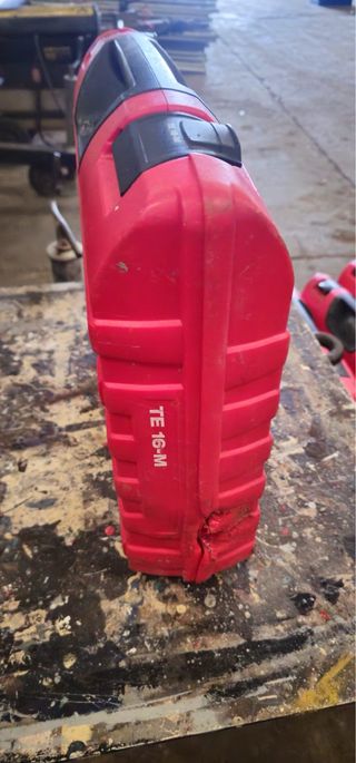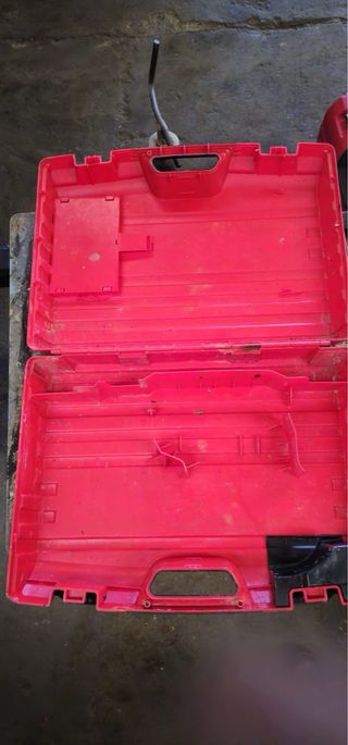 Caja de plástico roja para taladro Hilti TE-16M. Presenta marcas de uso y un golpe en una esquina. - Modelo: TE-16M - Color: Rojo - Material: Plástico