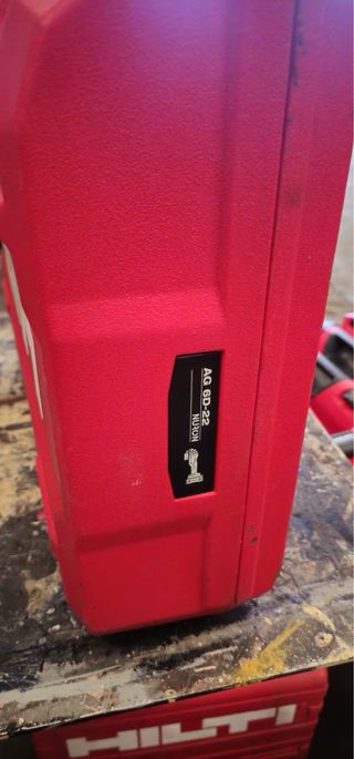 Caja de almacenamiento Hilti para radial de batería AG 6D-22. Es de color rojo y cuenta con un asa negra. - Marca: Hilti - Modelo: AG 6D-22 - Color: Rojo - Asa: Negra