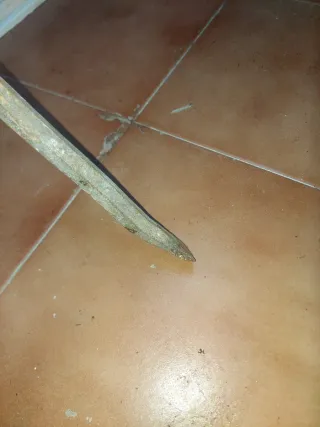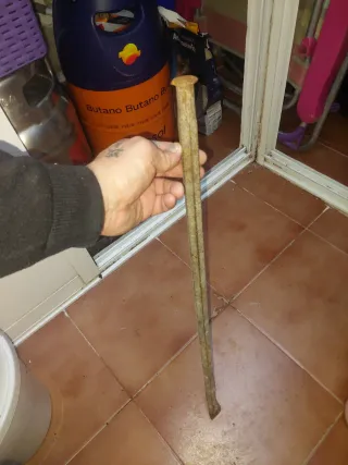 Herramienta de metal de 70 cm de largo. - Forma alargada y delgada. - Extremo superior con cabeza. - Extremo inferior afilado.