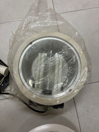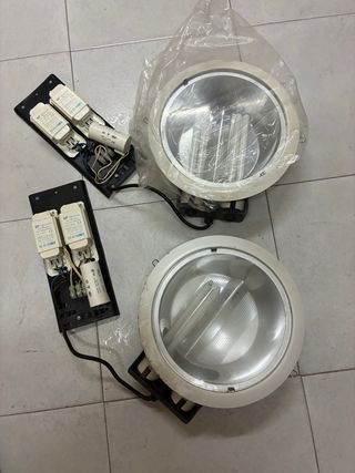 Vendo lote de focos/luminarias empotrables de gran formato, ideales para locales comerciales, naves, garajes, trasteros, talleres o iluminación industrial. 📦 El lote incluye: • 2 focos circulares empotrables completos • Reactancias y cableado incluidos (ver fotos) • Portalámparas y componentes eléctricos montados 💡 Funcionan con tubos fluorescentes (no LED). 🛠️ Construcción robusta, pensados para uso profesional. 📸 Estado: • Uno prácticamente sin uso (con plástico protector) • Otro con señales estéticas de uso normal Funcionamiento correcto antes de desmontar. Se vende el lote completo, tal y como aparece en las imágenes.