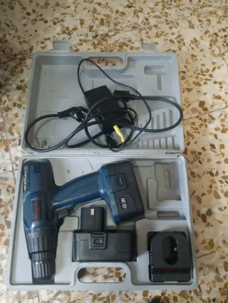 Taladro atornillador a batería de 18V, ideal para trabajos en casa o profesionales. Incluye su cargador y batería. - Taladro atornillador de color azul y negro. - Batería de 18V. - Cargador de batería. - Maletín de transporte.