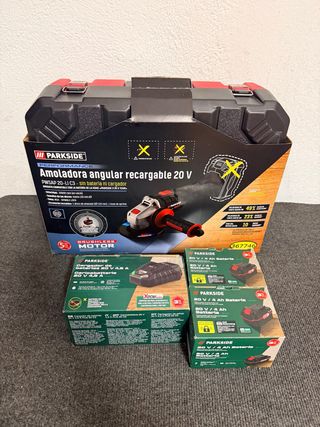 Se venden herramientas Parkside, un taladro percutor y una radial angular. - Taladro percutor recargable 20V. - Radial angular recargable 20V. - Incluye dos baterías de 2.0 Ah y cargador rápido de 2.4 A. - Incluye maletín de transporte.