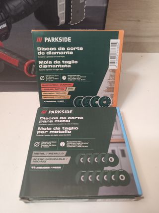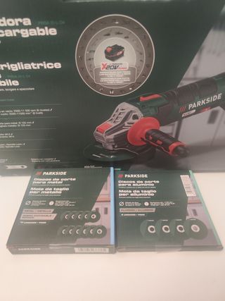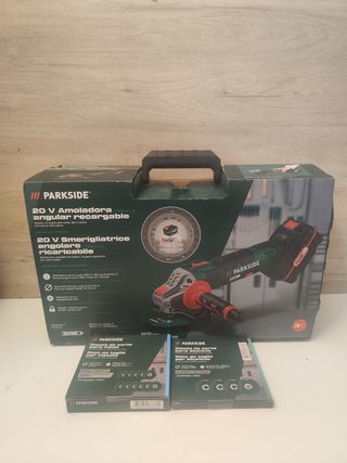 Amoladora angular PARKSIDE 20V Performance. - Modelo: PWSA 20-Li B2. - Sin batería ni cargador. - Incluye discos de corte para aluminio, metal y diamante.