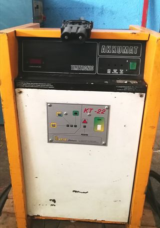 Cargador de carretilla elevadora - Carcasa de metal amarilla y blanca. - Conector de carga. - Panel de control con indicadores.