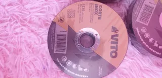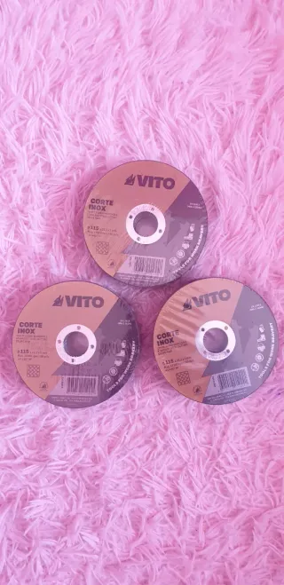 Paquete de 25 discos de corte para acero inoxidable marca Vito. - Diámetro: 115 mm. - Grosor: 1 mm. - Eje: 22,2 mm. - Máxima velocidad: 13300 rpm | 80 m/s. - Modelo: 41 A46T BF. - Fabricado en PRC. - tengo 3 paquetes de disco corte, cada paquete lleva 25 unidad, cada paquete 10 euros los tres 30 euros