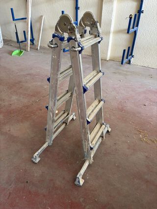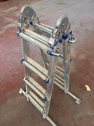 Escalera industrial de aluminio, diseñada para ser versátil y resistente. Su estructura permite diferentes configuraciones para adaptarse a diversas tareas. - Fabricada en aluminio. - Diseño plegable para fácil almacenamiento y transporte. - Múltiples posiciones de uso.