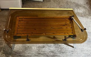 Ventana lateral para caravana o autocaravana Moncayo. Pieza de repuesto. Medidas en fotos - Marco de color dorado. - Panel de listones de madera.