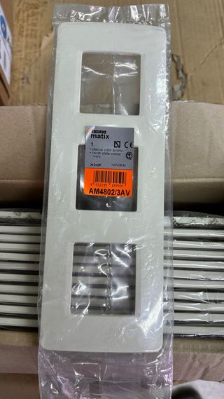 Tapa de la serie Matix de Bticino para tres módulos. 3€ cada tapa 25€ los 12 que hay en la caja - Color: Marfil (Ivory). - Acabado: Placa color avorio. - Modelo: AM4802/3AV.