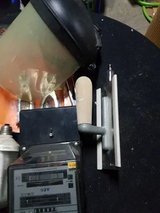 Conjunto de herramientas y medidor eléctrico. - Medidor eléctrico AEG NONOFASICO HILOS. - Spray Lamon. - Bombilla. - Alicates. - Paleta de albañil. Cc16.01