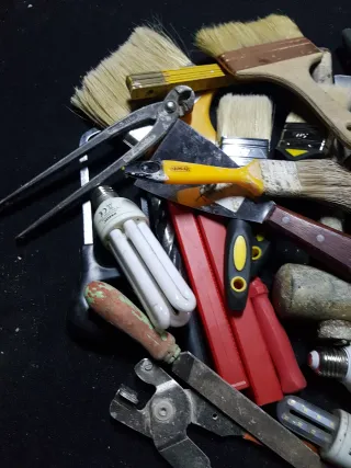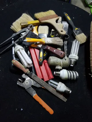 Lote de herramientas para pintura y otros usos. - Variedad de pinceles y brochas. - Alicates y herramientas de corte. - Bombillas de bajo consumo. Vc16.3