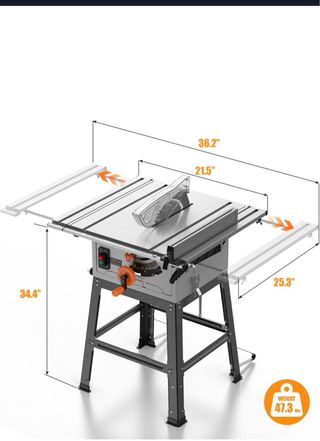 Sierra de mesa con varios accesorios incluidos para tus proyectos. - Sierra de mesa con base. - Guía de inglete. - Tope paralelo.
