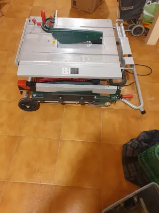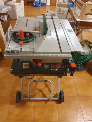 Sierra de mesa Bosch PTS 10 en buen estado. - Potente motor para cortes precisos. - Diseño compacto y portátil. - Incluye guía de inglete para cortes angulares. - Base robusta con ruedas para fácil movilidad.