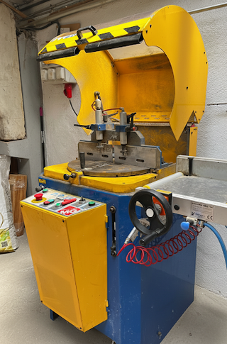 Tronzadora ingletadora . Tiene un sistema de control neumático con 2 pistones que sujeta el perfil , cortes precisos y un retorno rápido. 2 cabezales con discos de 375 mm x eje de 32 mm. Corta el perfil de aluminio a 45º con la menor cantidad de desechos. Medidas exteriores: AnchoxFondoxAlto : 84x70x147 cm.