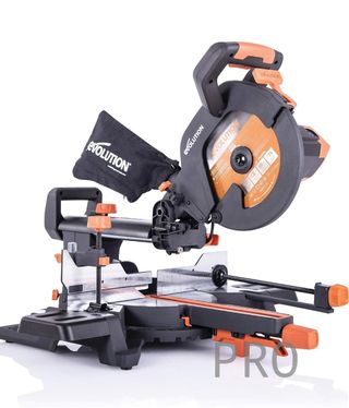 Evolution Power Tools R210SMS+ Ingletadora deslizante multimaterial COMO NUEVA - Multimaterial; hoja (TCT) con punta de carburo de tungsteno incluida; corta acero, aluminio, madera con clavos incrustados, plástico - Hoja R210-TCT multimaterial (24 dientes) incluida - Sistema de hoja y caja de engranajes optimizada de 1500 W - Corte de precisión con guía láser, zanjadora, corredera de 230mm, ajuste de bisel de 0-45 grados y de inglete de 50-50 grados; cubre todos los ángulos de corte habituales - Velocidad: 3"750 min-1 - Saco captapolvo incluido 57,5l. x 31,4an. x 61al. cm 11,2kg