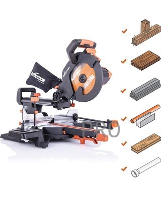 Evolution Power Tools R210CMS Multimaterial Sierra Ingletadora - Corta acero dulce, aluminio, plástico, madera con clavos incrustados, 210 mm Potente: Sistema de hoja y caja de engranajes optimizada de 1200 W que prolonga la vida útil del motor y de la cuchilla para cortar con facilidad una gran variedad de materiales Precisa: Corte de precisión biselado de 0-45 grados y ajuste de inglete de 45-45 grados, capacidad de corte transversal máximo de 125 x 55 Hoja R210-TCT multimaterial (24 dientes) incluida