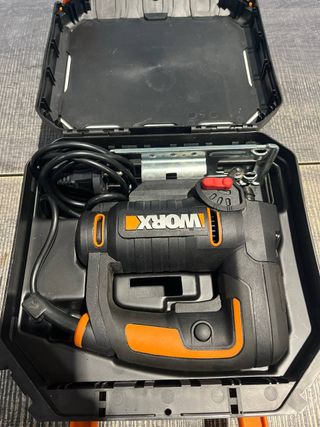 Sierra de calar WORX WX477.1 de 550 W para cortar madera, acero y aluminio, ideal para cortes a inglete, con extracción de polvo integrada, cambio de hoja sin herramientas y estuche. 6924328305873 No incluye cuchillas, sin arandela de montaje de cuchillas