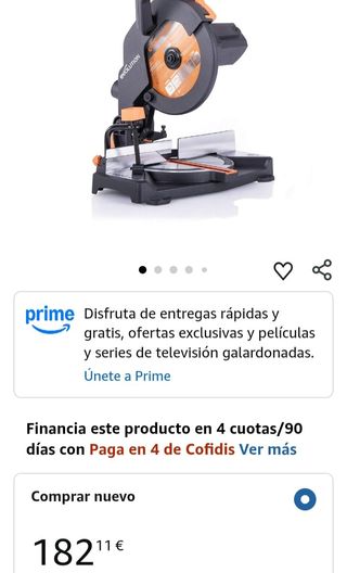 PVP Amazon 370€!!!.Nueva sin abrir la caja.Posibilidad de garantía de un año.Ingletadora Evolution R255SMS-DB. - Disco de corte. - Base de aluminio. - Asa de transporte. Evolution Power Tools R255SMS-DB ingletadora, Sierra ingletadora deslizante multimaterial de 255 mm, con doble bisel y paquete plus, hasta 300 mm x 90 mm, 5° a izquierda y derecha, inglete de 50° Ingletadora Evolution R255SMS-DB en color negro y naranja. - Disco de corte incluido. - Base robusta para mayor estabilidad. - Asa de transporte ergonómica.