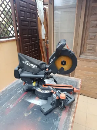 Ingletadora telescópica de la marca Evolution. 1500W. Ideal para cortes precisos. Disco de 210 mm, funciona perfectamente sin problema - Diseño robusto y compacto. - Asa ergonómica para un mejor agarre. - Base estable para mayor seguridad.