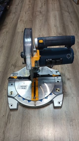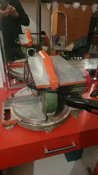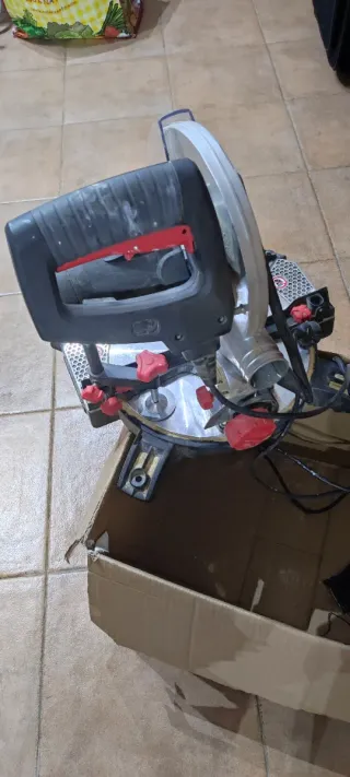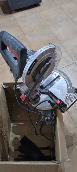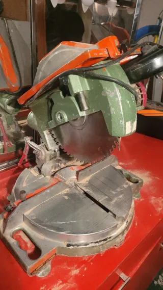 Sierra ingletadora en buen estado, lista para usar. - Mango ergonómico con gatillo. - Ajustes de ángulo precisos. - Base estable para cortes seguros.