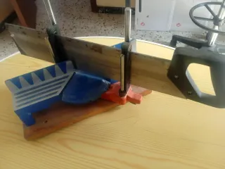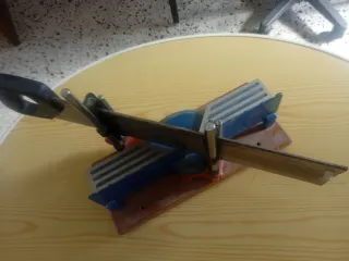 Herramienta para cortes precisos en madera. - Base de madera. - Guías de corte en plástico azul. - Sierra de mano incluida.