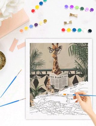Pintura por números dyi. He comprado dos por error. El dibujo es de una jirafa leyendo el periódico en el wc. Por mi experiencia con productos de esta misma marca, la pintura es de muy buena calidad. Incluye dos pinceles que, si bien sirven para el cuadro, no son de muy buena calidad (si tienes otros mejor). 40x50cm. Habría que comprar, una vez finalizado, el marco o la montura de madera. Realmente muy bonito, yo tengo otros de la misma colección colgados en casa.