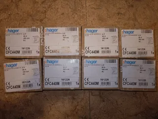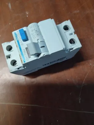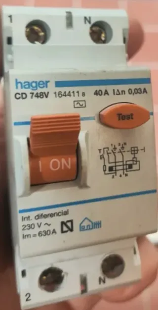 Interruptor diferencial Hager de 4 polos, modelo CF 440M. - Intensidad nominal: 40A. - Corriente residual: 0,3A. - Tensión nominal: 230/400V~. - Poder de corte (Im): 1500A. -25€ cada uno