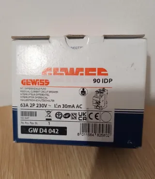 Interruptor diferencial residual de la marca Gewiss. Si compra lote 5 te salí 25€ unidad - Modelo: 90 IDP - Intensidad nominal: 63A - Número de polos: 2P - Corriente residual diferencial: 30mA AC - Tensión nominal: 230V ~ - Referencia: GW D4 042
