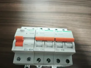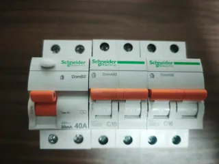 Conjunto de interruptores diferenciales y magnetotérmicos para cuadro eléctrico. - Interruptor diferencial ATMOSS RNR3-63, 40A, 30mA. - Interruptor magnetotérmico Schneider Electric C10. - Interruptor magnetotérmico Schneider Electric C16. - Interruptor magnetotérmico Schneider Electric IDK 40A.