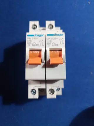 Se vende lote de dos interruptores automáticos de la marca Hager. - Interruptor Hager MN 916V C16. - Interruptor Hager MN 925V C25. - Color naranja para el selector ON/OFF. Material nuevo Tengo más material eléctrico en mi perfil. Interruptores, diferenciales. Legrand, Hager.