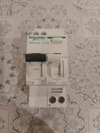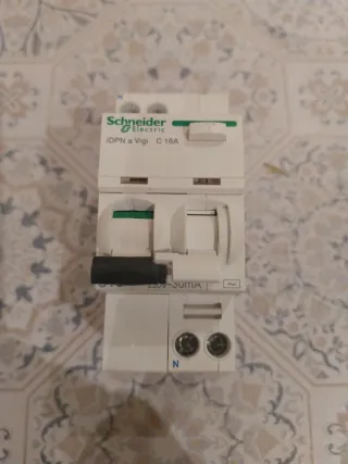 Interruptor diferencial y magnetotérmico de la marca Schneider Electric. Vigi F+N Ideal para espacios reducidos al ocupar la mitad de huecos. Prácticamente nuevo muy poco uso. Entrega en mano en Madrid Avda de Manoteras o envío a través de Wallapop a toda España. Sin engaños ver opiniones en mi perfil de Wallapop. - Modelo: iDPN a Vigi C 16A. - Intensidad nominal: 16A. - Sensibilidad: 30mA. - Tensión: 230V. - Tipo: F+N.
