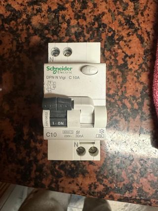 Dos interruptores diferenciales Schneider Electric. - Modelo: DPN N Vigi C 10A. - Intensidad nominal: 10A. - Sensibilidad: 30mA. - Tensión nominal: 230V~.