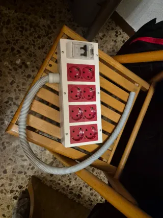 Base de enchufes con diferencial incorporado. Cuenta con cuatro tomas de corriente dobles y un interruptor de seguridad. - Cuatro pares de enchufes. - Interruptor de seguridad visible.