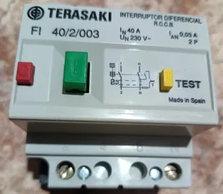 Interruptor diferencial Terasaki FI 40/2/003. - Corriente nominal: 40 A. - Tensión nominal: 125/220 V. - Sensibilidad: 0,03 A. - Tipo: RCCB. - Número de polos: 2P. - Incluye botón de test.