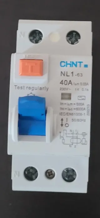 Interruptor diferencial Chint NL1-63 de 2 polos y 40A. - Capacidad de interrupción: 6000A. - Sensibilidad: 0.3A. - Tensión nominal: 230V. - Frecuencia: 50/60Hz. - Cumple normativa IEC/EN61008-1.